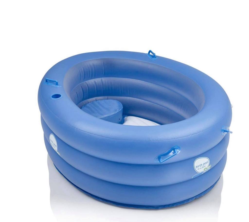 Birth Pool in a Box is comfortable and welcoming with handles in the right places. It has a built in seat for bonding with baby after birth.